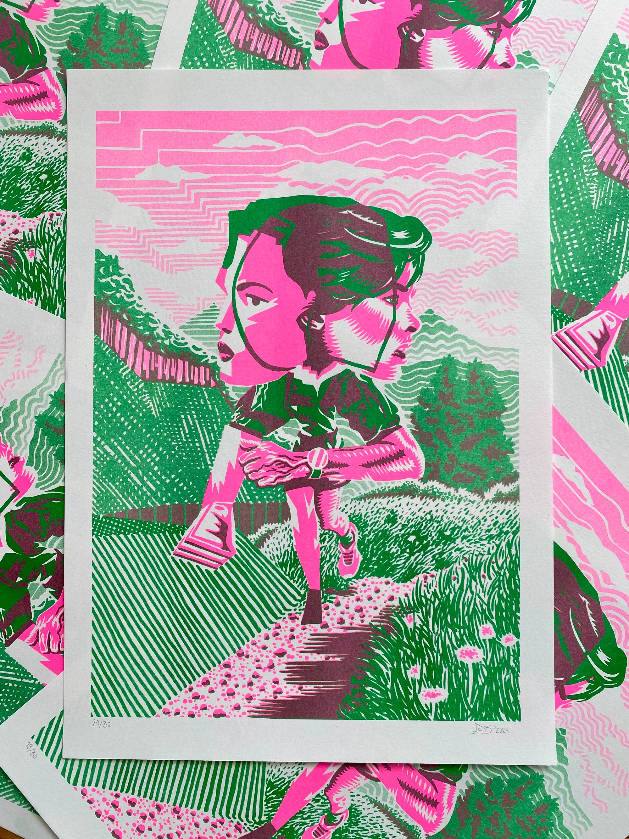 Risographie 2 couleurs : rose fluorescent et vert